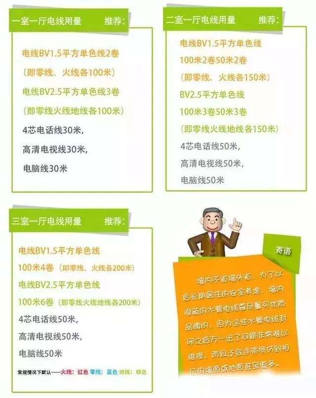 家裝布線小常識 線的分類:一般裝修時,紅色為火線,藍色、綠色、黃色任一種顏色為零線,雙色線為地線。 常規線路:常規線路設計中1.5平方用于照明線路,2.5平方用于插座線路。 弱電和強電:弱電和強電不能穿在一根管子里。 走明顯不穿管用:走明顯不穿官用一般用于施工或大功率空調上,一般很少用到。