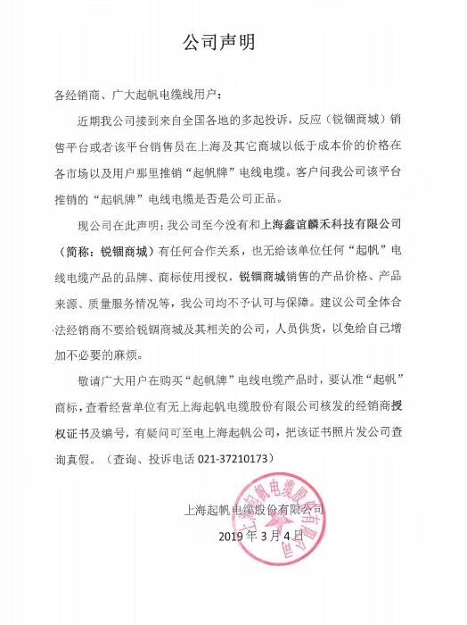 關于網(wǎng)上商城銳錮銷售起帆牌電纜公告!